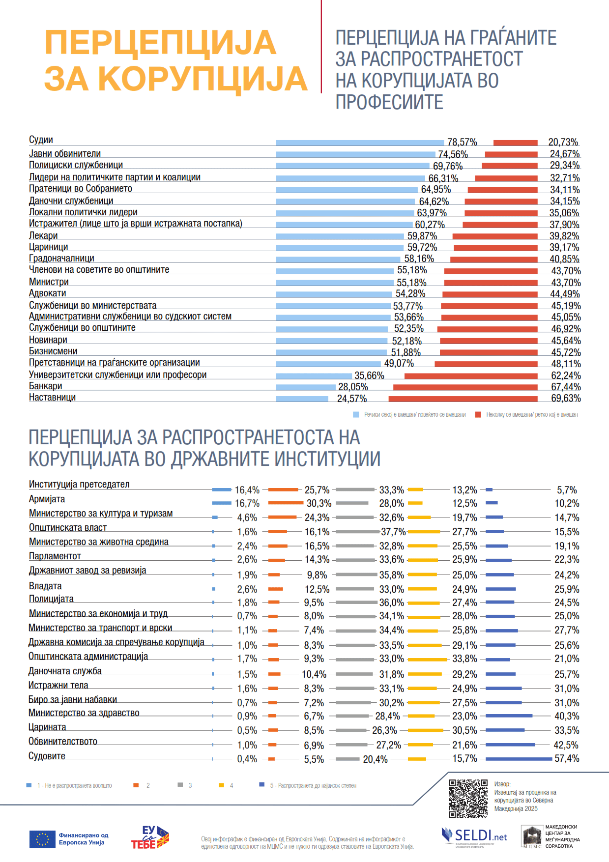 Во 2025 година судиите остануваат највисоко рангирани како корумпирана професионална група, односно 79% од граѓаните сметаат дека речиси сите или повеќето судии се вклучени во корупција. По нив следуваат јавните обвинители (74,6%), полициските службеници (69,8%), лидерите на политички партии (66,3%) и пратениците (64,9%). Најниска перцепција за корупција и понатаму има кај наставниците (24,6%) и банкарите (28,1%), како и кај универзитетските професори и граѓанските организации, кои остануваат под прагот на мнозинска недоверба.