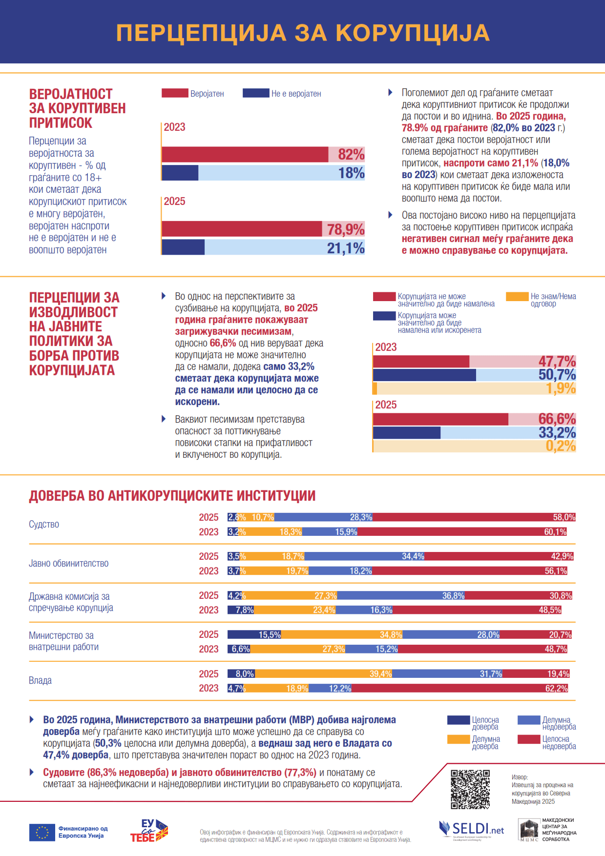 И на институционално ниво, судовите остануваат на врвот според распространетоста на корупцијата, односно 73,1% од испитаниците им дале високи оценки (4 и 5). Следуваат обвинителството (64,1%), царината (64,0%) и Министерството за здравство (63,3%). Резултатите укажуваат дека граѓаните сè повеќе ја перципираат корупцијата како системски проблем, обликуван од општата состојба во општеството, медиумите и јавните дебати, а не само од лично искуство. Иако довербата во Владата и министрите бележи подобрување, вниманието на јавноста сè повеќе е насочено кон судството, обвинителството, полицијата и царината, додека образованието, банкарството и граѓанскиот сектор остануваат меѓу најмалку корумпираните области. Истражувањето покажува дека поголемиот дел од граѓаните очекуваат коруптивниот притисок да продолжи. 78,9% сметаат дека постои веројатност или голема веројатност за коруптивен притисок, додека само 21,1% веруваат дека тој ќе биде мал или воопшто нема да постои. Ова ја потврдува перцепцијата дека корупцијата останува сериозен системски проблем. Во однос на можноста за намалување на корупцијата, граѓаните се загрижувачки песимисти, односно 66,6% сметаат дека корупцијата не може значително да се намали, додека 33,2% веруваат дека може да се намали или целосно искорени. Песимизмот може да го зголеми прифаќањето и ризикот од вклученост во коруптивни практики. Сепак, перцепциите за доверба во антикорупциските институции покажуваат позитивен тренд. Во 2025 година, 47,4% од граѓаните изразиле целосна или делумна доверба во Владата, наспроти 23,6% во 2023 година. Министерството за внатрешни работи бележи најголем раст на доверба (50,3% во 2025 г.). Во споредба со тоа, ДКСК бележи благо зголемување на недовербата, а судовите (86,3%) и обвинителството (77,3%) и натаму се институциите со најниска доверба за справување со корупцијата.